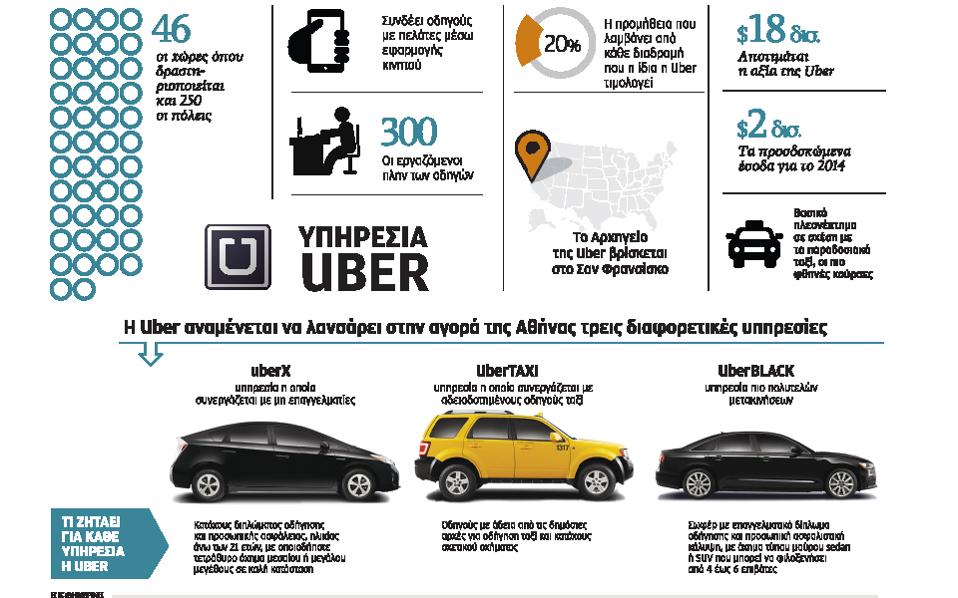 Η είδηση της άφιξης της Uber στην Ελλάδα προκαλεί ήδη αντιδράσεις, καθώς θεωρείται ότι θα λειτουργεί ευθέως ανταγωνιστικά προς τους επαγγελματίες αυτοκινητιστές, ειδικά μάλιστα εάν τηρεί το υψηλό επίπεδο εξυπηρέτησης που διαφημίζει, μεταξύ αυτών και τον αντικειμενικό τρόπο υπολογισμού του κομίστρου για τη διαδρομή, καθώς και τη λειτουργία σε 24ωρη βάση.Στην Αθήνα η Uber σχεδιάζει να αναπτύξει τρεις κατηγορίες υπηρεσιών: α) την UberX που απευθύνεται σε πολίτες, μη επαγγελματίες, με δίπλωμα οδήγησης και τετράπορτο αυτοκίνητο μεσαίου ή μεγάλου κυβισμού, β) την UberBlack, που απευθύνεται σε οδηγούς με επαγγελματικό δίπλωμα που διαθέτουν μαύρο αυτοκίνητο, σεντάν ή SUV (πρόκειται στην ουσία για υπηρεσία πολυτελούς μετακίνησης) και γ) την UberTaxi, η οποία απευθύνεται σε επαγγελματίες οδηγούς ταξί που διαθέτουν και αυτοκίνητο ταξί.