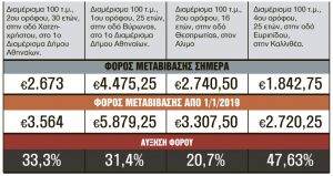 Από την Πρωτοχρονιά ενεργοποιούνται οι νέες αντικειμενικές αξίες για όλες τις μεταβιβάσεις και οι φόροι που επιβάλλονται στα ακίνητα παίρνουν φωτιά. Οι αγοραπωλησίες κατοικιών, οικοπέδων, επαγγελματικών ακινήτων θα κοστίζουν έως 50% ακριβότερα σε 3.792 περιοχές σε όλη τη χώρα όπου οι τιμές ζώνης τράβηξαν την ανηφόρα. Η αγορά ενός διαμερίσματος 100 τ.μ. στην Καλλιθέα επιβαρύνεται σήμερα με φόρο μεταβίβασης 1.842,75 ευρώ. Από την 1η Ιανουαρίου ο φόρος μεταβίβασης για το ίδιο ακίνητο εκτοξεύεται στις 2.720,25 ευρώ καταγράφοντας αύξηση 47,63%.