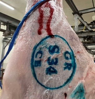 - Τα σφάγια που έχουν σφαγεί στη χώρα μας είτε έχουν εκτραφεί στην Ελλάδα ή σε Κράτος Μέλος της Ε.Ε., έχουν σφραγίδα καταλληλότητας χρώματος «λαμπρού κυανού» δηλαδή τυρκουάζ, στο κέντρο της οποίας αναγράφεται ο κωδικός αριθμός κτηνιατρικής έγκρισης του σφαγείου και περιφερειακά τα αρχικά GR και τα διακριτικά της Ε.Ε.